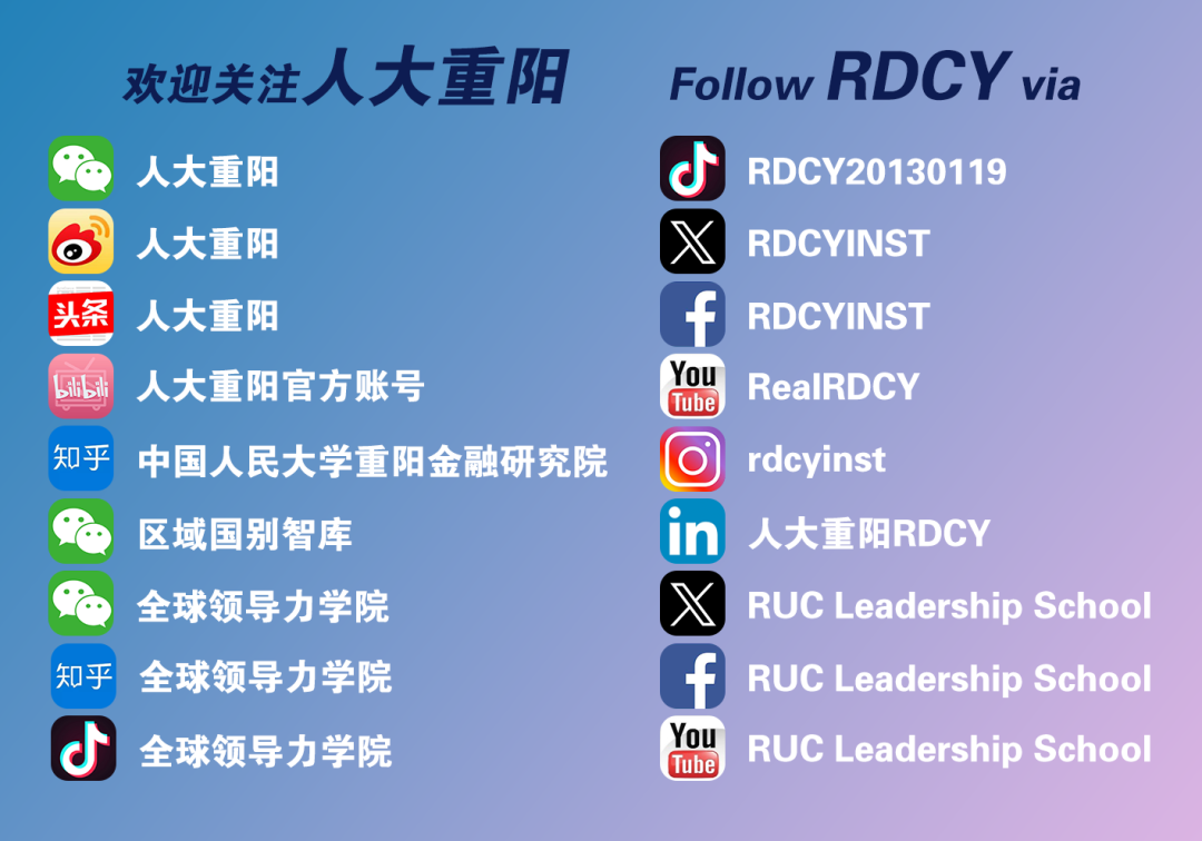 为增进与粉丝们的互动,让大家有更好的交流体验,人大重阳建立了“企业”“学术”两大社群,欢迎感兴趣的朋友扫描上方二维码添加人大重阳工作人员的微信(rdcy2013sph)备注姓名、单位、职务及想加入的群聊,审核通过后工作人员会将您拉入群内。