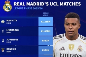 皇马本赛季欧冠联赛阶段对手身价: