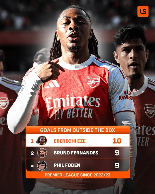 LiveScore统计显示,自2022/23赛季以来,埃泽在英超禁区外已打入10球,是同期英超远射进球最多的球员。B费和福登均为9球,并列排在其后。