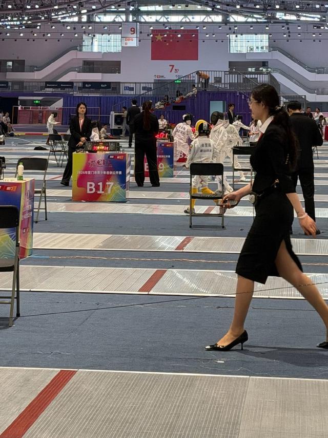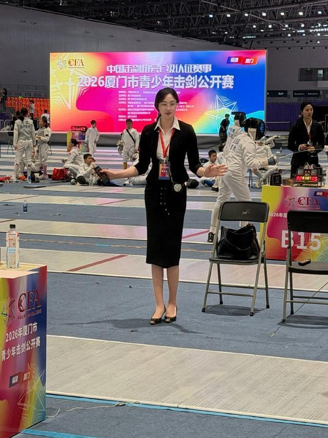 4月13日,前击剑运动员秦雪在社交媒体上分享了自己执裁青少年击剑比赛的照片。