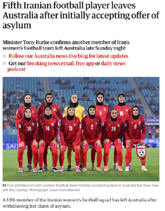已有5人反悔 伊朗女足队长放弃庇护+深夜回国 外媒:她的家人失踪